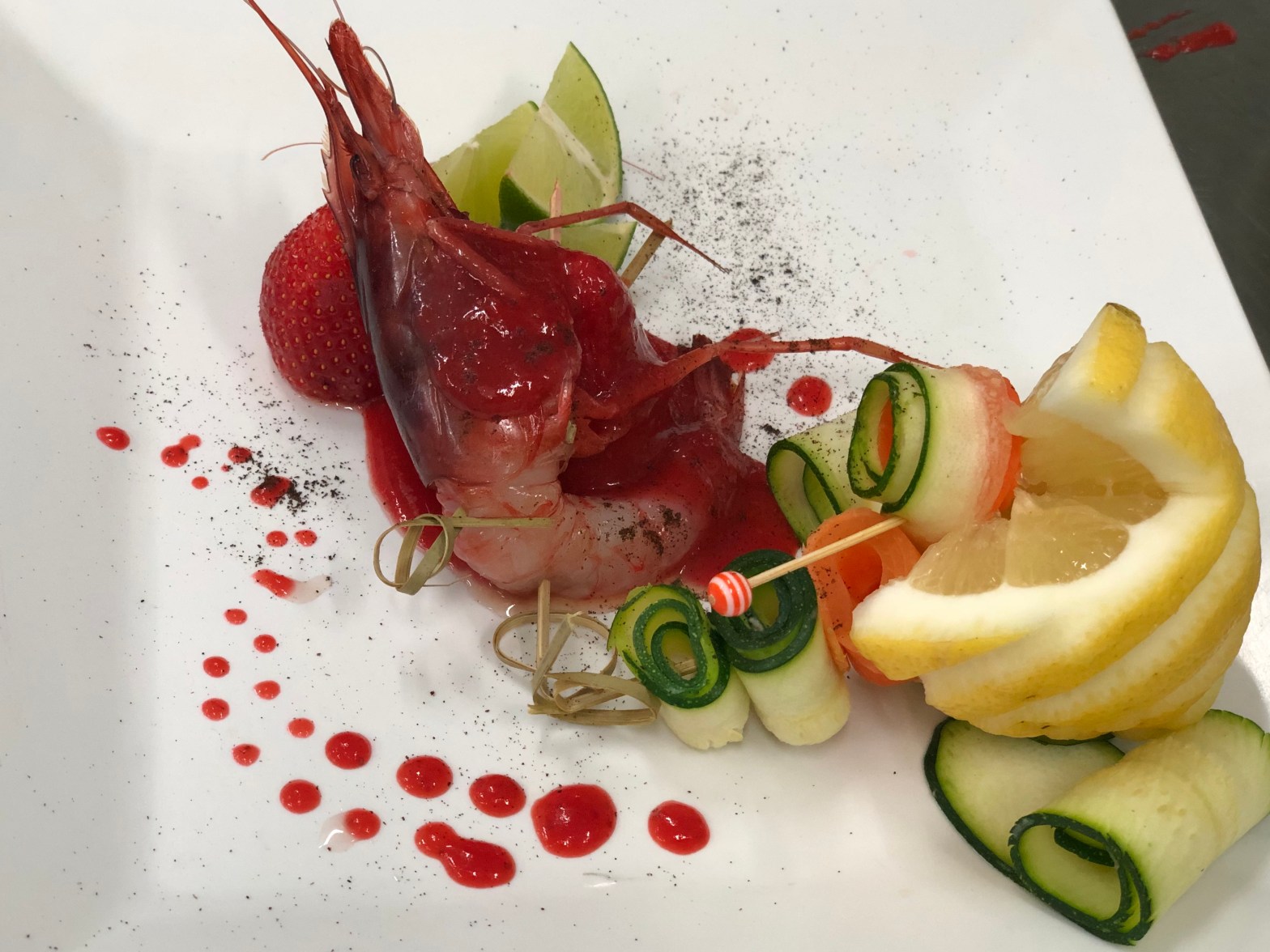 Gamberone sfarfallato al ron, con anello di pan fritto, caramellato con croccante alle noci, e lime.